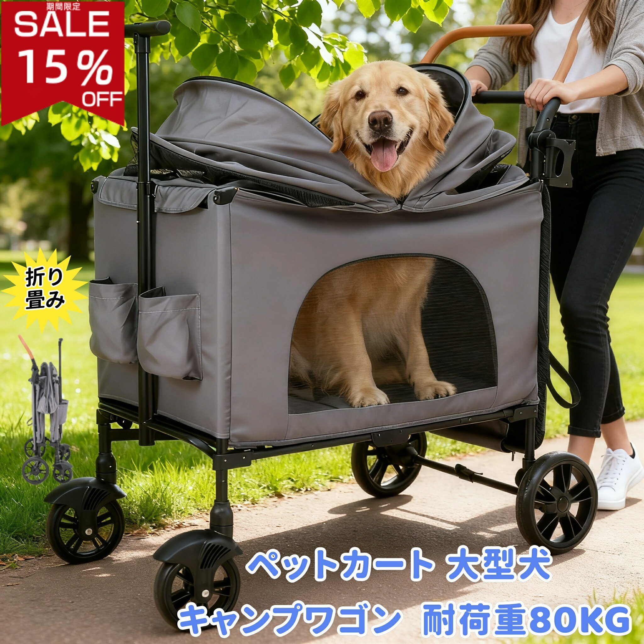 商品情報商品について【広々スペース&四季使用可能】 ペットカートの内部サイズは 82cm×52cm×44cm(日除けシェルター高さ 41cm)で、ゴールドレトリバー、ラブラドール、柴犬、コーギーなどの中大型犬や、テディ、猫など複数匹のペットを同時に乗せるのに適しています。スペースが十分にあるため、ペットが中で横になっても窮屈さを感じることがなく、一年中使用できます。【乗り降り簡単】 カートの後方車板を開いて下ろすと、ペット用のスロープが形成されます。飼い主は大型犬を抱き上げてカートに乗せたり降ろしたりする手間が省け、高齢犬や病気のペットも楽に乗り降りできます。(犬はストレスに対して感受性が高く、老齢犬は特にです。犬は体調が悪いときほど抵抗力が弱く、さまざまな感染症にかかりやすいものです。社交の場でも散歩でも、ベビーカーの中に座ればストレスが解消され、病気のリスクも減ります。)【安定した乗り心地】 大サイズの車輪を採用し、車輪内部に減衰設計があるため、路面の凹凸による振動を効果的に緩和できます。同時に減衰性能に優れた EVA 素材を使用し、乗車中のペットを優しく保護します。【前輪】: 360 度自在に回転し、方向転換が?便です。【後輪】足踏み式ブレーキ装置が付いており、転倒を防止。足で軽く操作するだけでロックでき、休憩場所や坂道でもしっかり止まります。【組み立て不要&折りたたみ簡単】※このカートは組み立て不要です。折りたたみ固定フックを解除した後、カート本体を下に押すか、両側に広げるだけで簡単に開くことができます。※折りたたみ方法も簡単です。カート本体内部のリングを上に引っ張るだけで収納完了です。その後、車輪の折りたたみ固定フックを留めれば、折りたたんだ状態をしっかり固定できます。【安全ベルト設計】 ペットカートには逃げ防止用の安全ベルトを 2 本付属しています。1?2 匹の活発なペットを飼っている場合、この設計でペットの脱走や飛び跳ねによる骨折リスクを効果的に防ぐことができます。ハーネスと組み合わせて使用することを推奨します。「耐荷重80KG」ペットカート大型犬 ペットカート 多頭 ペットキャンピングカー ペットカート ペット用多機能 折り畳み 多頭用 大型ペットカート 中型犬 簡単に収納 便利 散歩 車いす ペット用大型犬 カート 介護用防災 旅行 避難【即納】 キャンピングカートワゴン アウトドアキャリーワゴン ペット用 大容量 猫 犬 多頭 折りたたみ 組立簡単 多機能 通気 軽量 お出かけ便利 ブレーキ付き 飛び出し防止 コンパクト豪華な4輪 5