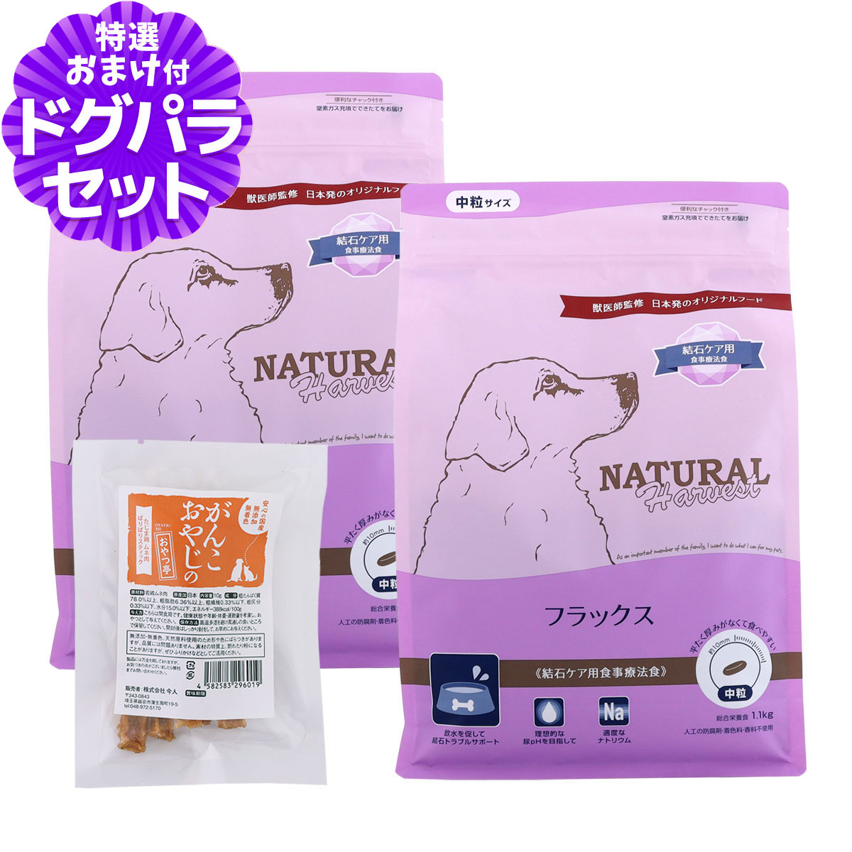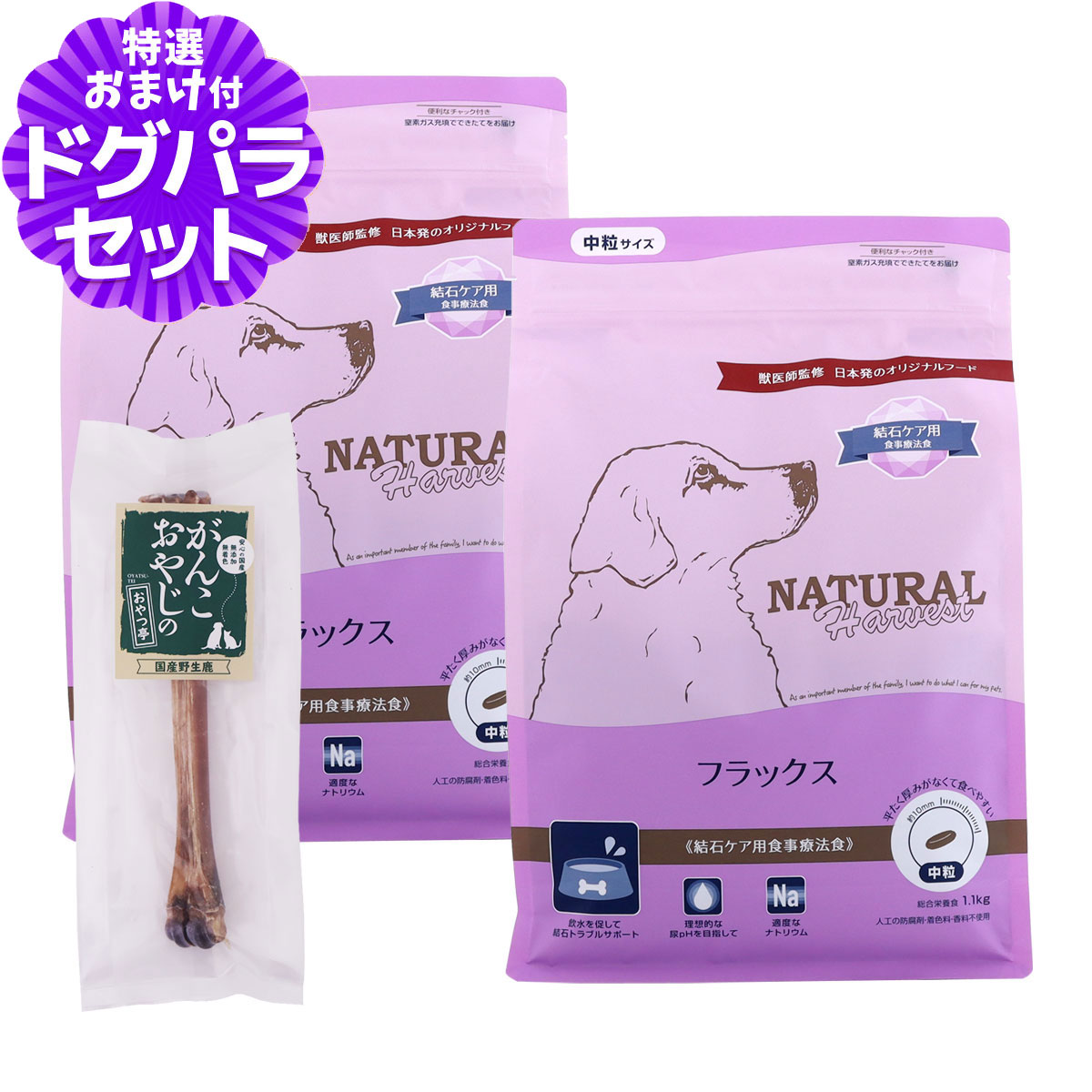 ナチュラルハーベストの解説 ナチュラルハーベストは、日本特有の気候や環境を考えて、日本に住む犬の為に設計された日本発オリジナルドッグフード。遺伝子組み換え作物を使用せず、アレルギーになりにくいとされる肉類をできるだけ主要たんぱく質にするなど、栄養学に基づいて原材料を取り入れているプレミアムドッグフードです。 ナチュラルハーベスト フラックス 結石ケア用の詳細 対象 成犬・シニア犬用 ナチュラルハーベスト フラックス 結石ケア用について 水分の摂取量を増やして尿量を増やし、結石を作らせないことを目指した結石ケア用食事療法食です。ミネラルバランスとたんぱく質量を調整することで、お水を飲む量が自然と増える身体の仕組みに着目。尿が濃くなることを予防し、結石の核となる老廃物の排出をサポートします。 飲水を促して結石トラブルサポート アミノ酸を強化して自然な飲水を促進。尿が濃くなる事を予防します。 理想的な尿pHを目指して 尿を弱酸性に保つDL-メチオニン、尿路の健康をサポートするクランベリーを配合しました。 適度なナトリウム 飲水の促進に欠かせないナトリウムを適量配合。過剰なナトリウムによる心臓・腎臓への負担に配慮しました。 その他 ■パッケージ・内容成分などは予告なく変更になることがございます。ご了承くださいませ。 ※当店の商品は全て正規品です。安心してお買い求めください。 ドッグフード/療法食/ナチュラルハーベスト/結石/成犬/シニア犬/高齢犬/尿路ケア/ナトリウム/ドライフード商品名 ナチュラルハーベスト フラックス 結石ケア用 結石のトラブルが心配な愛犬のための食事療法食 商品特長 原材料 精製白米、ターキーミール、鶏卵、グルコース、サーモンミール、菜種油(ビタミンEで酸化対策済)、ビートファイバー、酵素分解チキンエキス、魚油(メンハーデン由来)、エムファイバー、酵母、海塩、亜麻仁、塩化カリウム、DL-メチオニン、フラクトオリゴ糖、塩化コリン、キレート亜鉛、キレート鉄、ビタミンC、硫酸カルシウム、ユッカ抽出物、ビタミンE、クランベリー、ローズマリー、タウリン、キレート銅、パパイヤ乾燥末、キチンキトサン、クエン酸、キレートマンガン、ナイアシン、セレン酸ナトリウム、パントテン酸カルシウム、リボフラビン、ビタミンA、ビオチン、硝酸チアミン、ビタミンD3、塩酸ピリドキシン、ビタミンB12、ヨウ化カルシウム、葉酸、アシドフィルス菌、フェシウム菌、カゼイ菌、プランタルム菌、酸化防止剤(ローズマリー抽出物) 保証成分 たんぱく質23.0%以上, 脂質10.0%以上, 粗繊維4.0%以下, 灰分7.0%以下, 水分10.0%以下 カロリー 327kcal/100g 原産国 米国 対象年齢 成犬〜シニア犬用 給与量目安 ・本商品は結石ケアを目的としているため、飲水を促すよう設計されています。 積極的な水分摂取が必要ですので、常時新鮮な水が飲めるようにしてください。 ・本品はAAFCO栄養基準に適合しており、本品と新鮮な水だけで必要な栄養素を満たすことができます。 ・表を目安に体重や便の状態、毛ヅヤなどを見ながら適宜調節してください。 ・初めて与える際は1週間ほどかけて徐々に切り替えてください。 ご注意 ・本商品は、進行した症状の改善や、既に形成された結石の溶解は目的としておりません。飲水量を増加させる働きがあるため、やや便が軟らかくなるようにしております ・冷暗所で保管し、開封後はお早めにご使用ください。 ・天然の原材料を使用し、人工の着色料や香料を使用していないため、色やにおい、粒の大きさに違いが見られます。 ・粒の中に有色の小片が見られる場合がありますが、ミネラルなどの栄養素です。 ・粒の中に原材料である食肉の体毛が一部残る場合があります。 商品についてのお知らせ