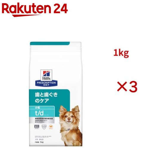 お店TOP>ペット用品>犬用食品(フード・おやつ)>犬用 食事療法食>ペット療法食・ドッグフード(ドライフード)>t/d 小粒 チキン 歯と歯ぐきのケア 犬用 特別療法食 ドッグフード ドライ (1kg×3セット)【t/d 小粒 チキン 歯と歯ぐきのケア 犬用 特別療法食 ドッグフード ドライの商品詳細】ペットも人と同じようにデンタルケアが必要です。 唾液や食物が歯に蓄積し、細菌が増殖し歯垢となり、そのまま放置されると長期にわたり口腔衛生上の問題を引き起こす可能性があります。歯周病とともに引き起こされる感染症は腎臓、心臓、および代謝系に影響を及ぼすことが最近の研究でわかっています。ヒルズのプリスクリプション・ダイエット 犬用 t/d ティーディー 小粒は、あなたの愛犬の歯と歯ぐきの健康をサポートする特別療法食です。t/d 小粒の特殊な粒を噛むことで、歯垢、歯石の蓄積を低減することが科学的に証明されています。【使用方法】給与方法・愛犬が適正な体重を維持できるように、必要に応じて量を調節してください。詳しくは獣医師にお問い合わせください。・獣医師の許可があれば、徐々に今までの食事を減らしながら新しい食事を増やして7日間ほどで切り替えます。・常に新鮮な水を飲めるようにしておいてください。・獣医師の指導のもとに給与してください。【t/d 小粒 チキン 歯と歯ぐきのケア 犬用 特別療法食 ドッグフード ドライの原材料】トウモロコシ、米、トリ肉(チキン、ターキー)、セルロース、動物性油脂、エンドウマメ、全卵、チキンエキス、植物性油脂、ミネラル類(カルシウム、リン、ナトリウム、カリウム、クロライド、銅、鉄、マンガン、セレン、亜鉛、ヨウ素)、乳酸、アミノ酸類(タウリン、トリプトファン、リジン)、ビタミン類(A、B1、B2、B6、B12、C、D3、E、ベータカロテン、ナイアシン、パントテン酸、葉酸、ビオチン、コリン)、酸化防止剤(ミックストコフェロール、ローズマリー抽出物、緑茶抽出物)【栄養成分】保証分析値:たんぱく質14.0%以上、脂質14.0%以上、粗繊維11.5%以下、灰分5.5%以下、水分10.0%以下代謝エネルギー:353kcal/100g【注意事項】・開封後はお早めにご使用ください。・保管時は袋を密閉し、直射日光・高温多湿を避けてください。・製品により、色、香り、質感、大きさ等が多少異なる場合がございますが、原材料由来のもので栄養上の問題はありません。・給与開始後も定期的に獣医師の診察をお受けください。経過によっては、最適な療法食が変わる場合もあります。・この製品は食事療法食です。給与に関しては、必ず獣医師の指示に従ってください。【原産国】オランダ【ブランド】ヒルズ プリスクリプション・ダイエット【発売元、製造元、輸入元又は販売元】日本ヒルズ・コルゲート(療法食)こちらの商品は、ペット用の商品です。※説明文は単品の内容です。・療法食は必ず獣医師の指示に従い、薦められたものをご購入・ご使用ください。・食事療法食製品を与えている間は、獣医師の診察を定期的にお受けください。リニューアルに伴い、パッケージ・内容等予告なく変更する場合がございます。予めご了承ください。(ドックフード いぬ 歯石 歯垢 口臭 歯ぐき ケア 歯肉炎 歯周病療法食 歯ミガキ はみがき 着色汚れ)・単品JAN:52742012414日本ヒルズ・コルゲート(療法食)102-0084 東京都千代田区二番町5-250120-211-323広告文責:楽天グループ株式会社電話:050-5577-5043[犬用品/ブランド:ヒルズ プリスクリプション・ダイエット/]