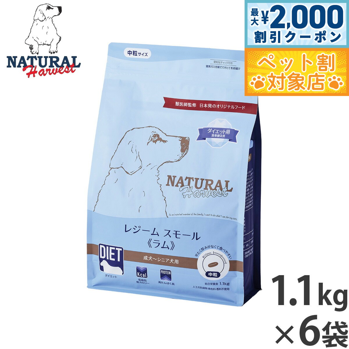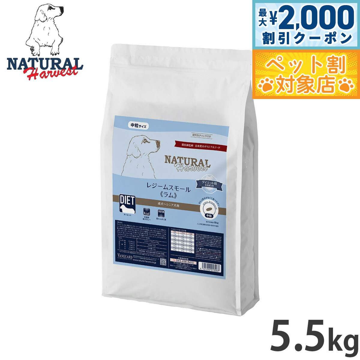 身体や毛ヅヤにダメージを与えない健康的な体重管理を目指したダイエット用食事療法食です。体重を減らすだけのダイエットではなく、たんぱく質をしっかりとることで筋肉量を増やし理想の体型へ導く、最新のダイエット理論に基づいた、しっかり食べて代謝を高める食事になるよう設計しました。商品名ナチュラルハーベスト ドッグフード レジーム スモール ラム ダイエット用食事療法食ブランドNatural Harvest原材料ラムミール(ニュージーランド)、玄米(米国)、精製白米(米国)、ポテト(米国)、オーツ胚芽(米国)、セルロース(米国)、メンハーデンミール(ブラジル)、濃縮メルルーサたんぱく質(チリ)、酵素分解チキンエキス(米国)、えんどう豆繊維(米国)、大麦(米国)、ひまわり油(ポーランド)、酵母(米国)、海塩(米国)、フラクトオリゴ糖(米国)、塩化カリウム(カナダ、米国)、塩化コリン(イギリス)、グルコサミン塩酸塩(インド)、コンドロイチン硫酸塩(米国)、ユッカ抽出物(米国)、硫酸鉄(米国、メキシコ)、キレート亜鉛(米国)、硫酸亜鉛(米国、メキシコ)、キレート鉄(米国)、ビタミンE(スイス)、硫酸銅(メキシコ)、塩化カリウム(カナダ、米国)、セレン酸ナトリウム(米国)、L-カルニチン(米国、アルゼンチン)、キレート銅(メキシコ)、ナイアシン(米国、インド)、パントテン酸カルシウム(スコットランド)、硫酸マンガン(メキシコ)、キレートマンガン(メキシコ)、リボフラビン(ドイツ、韓国)、ビタミンA(スイス)、ビオチン(米国、フランス)、硝酸チアミン(ドイツ)、ビタミンD3(フランス)、塩酸ピリドキシン(ドイツ)、ビタミンB12(フランス)、葉酸(フランス)、ヨウ化カルシウム(カナダ、米国)、アシドフィルス菌(米国)、フェシウム菌(米国)、カゼイ菌(米国)、プランタルム菌(米国)、酸化防止剤(ローズマリー抽出物)(米国)賞味期限製造から2年(メーカー出荷のタイミングによりばらつきがございます。詳細はお問い合わせください。)カロリー295kcal/100g原産国米国 成分:たんぱく質25.0%以上 脂質5.0%以上 粗繊維7.0%以下 灰分6.0%以下 水分10.0%以下実測値:オメガ6:オメガ3=0.9%:0.4%■ダイエット主要たんぱく質源は燃焼系アミノ酸L-カルニチン豊富なラム。低脂肪・高たんぱく質なフードで筋肉量を増やし、基礎代謝を上げて、健康的な体重管理をサポート。■低脂肪・低カロリー脂肪分は総合栄養食としてのAAFCO栄養基準の基準値ギリギリまで抑えました。100gあたりのカロリーは295kcalです。■高たんぱく質健康的なダイエットのために、筋肉のもととなるたんぱく質をしっかりと配合。豊富なたんぱく質と適度な運動で筋肉量を増やして消費カロリーを増やします。■高繊維豊富な食物繊維がカロリーを抑え、老廃物や過剰な栄養素を排出。減量中の空腹感も抑えます。■低炭水化物体脂肪を効率よく消費するために、エネルギー源となる炭水化物量を制限しています。■燃焼系アミノ酸主原料のラムに豊富に含まれる燃焼系アミノ酸L-カルニチンをさらに強化。脂質の代謝をサポート。■関節ケア体重による関節への負担を考慮してグルコサミン・コンドロイチンを配合しました。■理想的な体重の維持に体質から整えて体重を管理する総合栄養食。続けることで減量後も理想的な体重キープをサポート。■被毛ケアオメガ3脂肪酸と酵母で艶やかな被毛に。■腸内ケア4種の善玉菌で健康な腸内フローラをサポート。AAFCO成犬用栄養基準適合総合栄養食 【中粒】ダイエット用食事療法食成犬用 シニア犬用人工の防腐剤・着色料・香料不使用メーカー名株式会社バンガードインターナショナルフーズナチュラルハーベスト ドッグフード レジーム スモール ラム ダイエット用食事療法食身体や毛ヅヤにダメージを与えない健康的な体重管理を目指したダイエット用食事療法食です。体重を減らすだけのダイエットではなく、たんぱく質をしっかりとることで筋肉量を増やし理想の体型へ導く、最新のダイエット理論に基づいた、しっかり食べて代謝を高める食事になるよう設計しました。