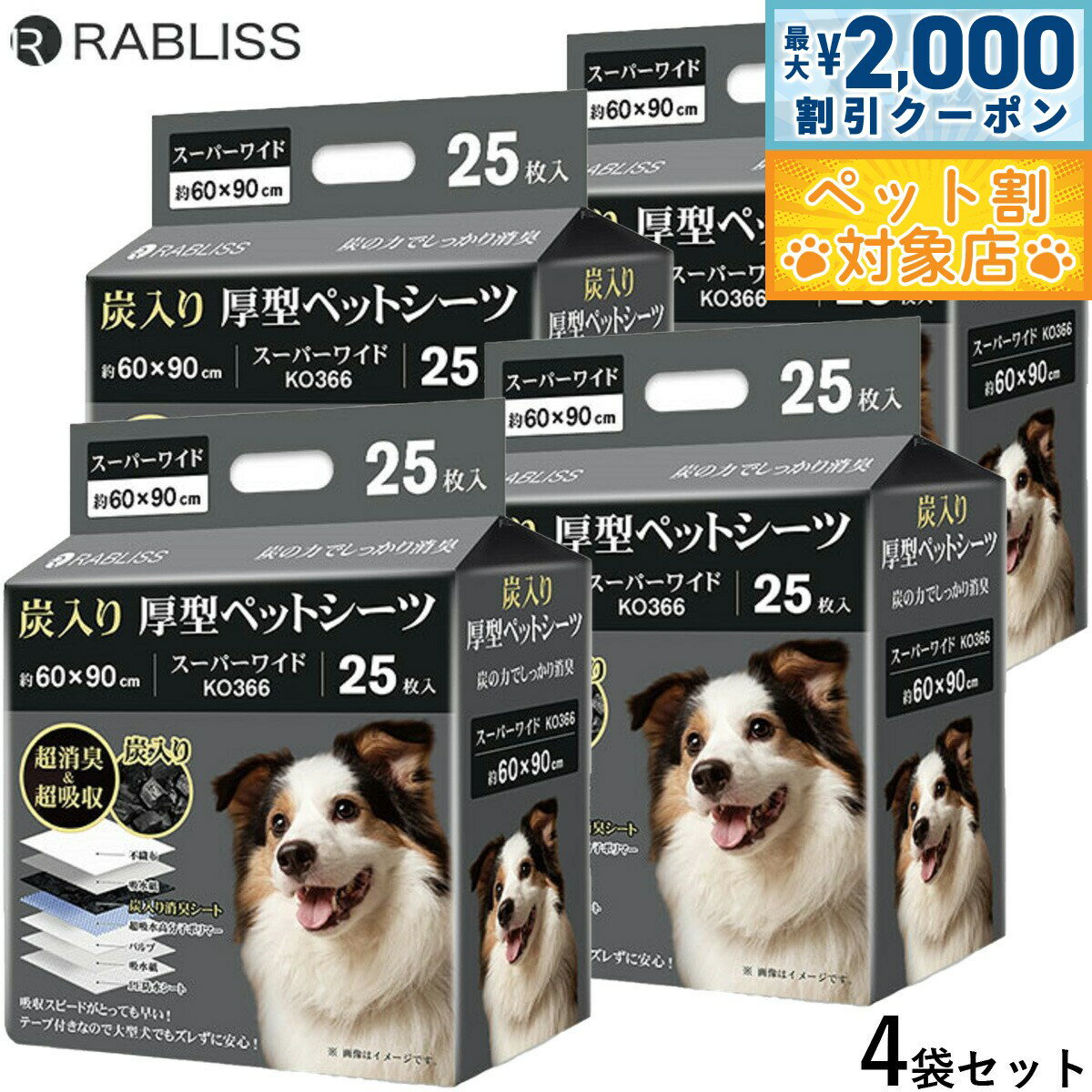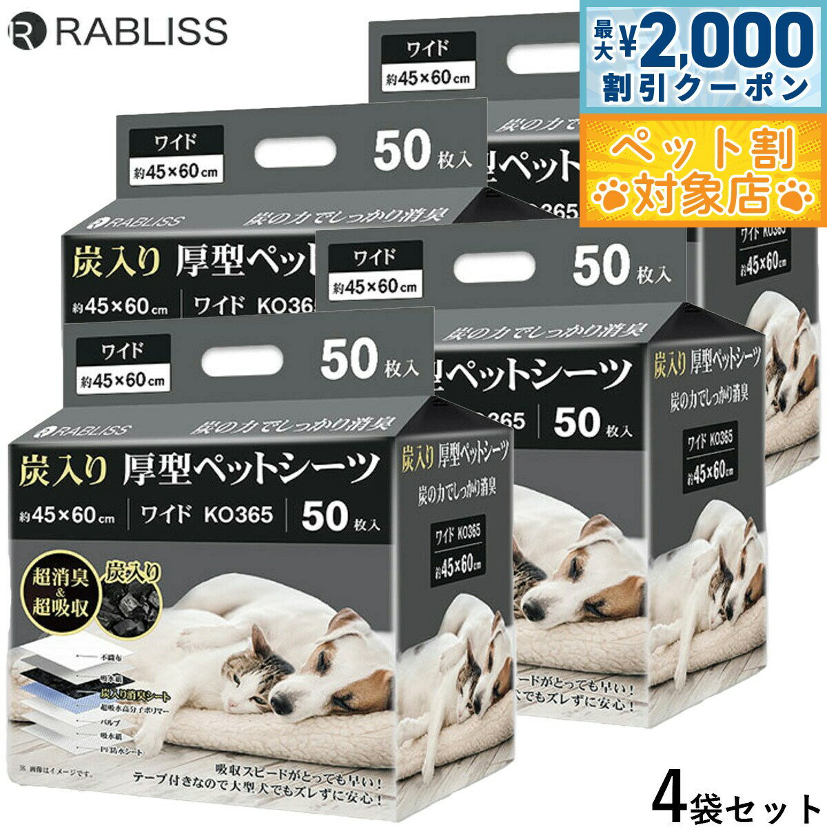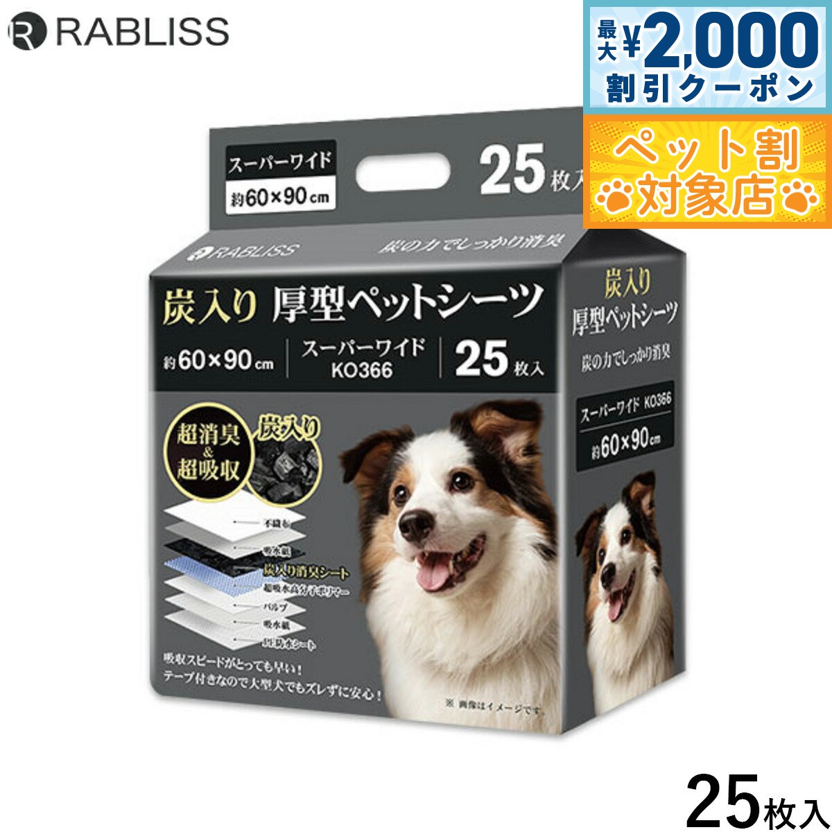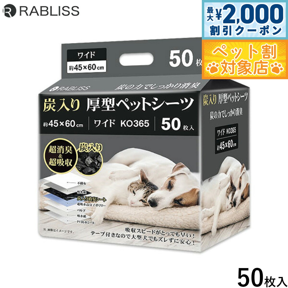 炭入りで超消臭&超吸収です。最高品質の高分子ポリマーを採用です。ポリマー量が薄型の約3.5倍です。ワイド、スーパーワイドの2サイズ展開です。高いコストパフォーマンスです。絶妙な圧縮具合で抜群の吸収速度を実現します。裏漏れを防ぐバックシートです。エンボス加工のスポット吸収で、おしっこが広がりにくいです。シート裏にテープがついているので、ずれにくいです。商品名RABLISS 炭入り厚型 ペットシーツブランドRABLISS材質不織布、吸水紙、炭入り消臭シート、超吸水性高分子ポリマー、パルプ、PE防水シート大きさ約 45×60cm原産国中国 炭の力でしっかり消臭。消臭&吸収スピードにこだわったテープ付きペットーシーツ【商品特徴】圧倒的な吸収力&スピード●吸収が抜群に早いポリマー量が薄型の約3.5倍※当社比●エンボス加工でスポット吸収圧縮し過ぎていないエンボス加工で表面の水分が広がりにくい●6層構造と全面接着シーツでしっかり吸収!●大容量の高分子吸収ポリマーがシーツの全面に散布!●裏漏れ防止のバックシーツ構造、バックシーツとして利用可能!●シーツの端っこも漏らしません!●驚きのコストパフォーマンス!【注意事項】●商品圧縮の際にシートの角が折れている場合があります。 商品の使用や機能に問題はありませんのでご安心ください。 低価格での販売に努めておりますため、ご理解いただけましたら幸いです。●商品の入荷時期によって、外箱の印字やラベルが変わる場合がありますのでご了承ください。メーカー名KAEI株式会社RABLISS 炭入り厚型 ペットシーツ炭入りで超消臭&超吸収です。最高品質の高分子ポリマーを採用です。ポリマー量が薄型の約3.5倍です。ワイド、スーパーワイドの2サイズ展開です。高いコストパフォーマンスです。絶妙な圧縮具合で抜群の吸収速度を実現します。裏漏れを防ぐバックシートです。エンボス加工のスポット吸収で、おしっこが広がりにくいです。シート裏にテープがついているので、ずれにくいです。