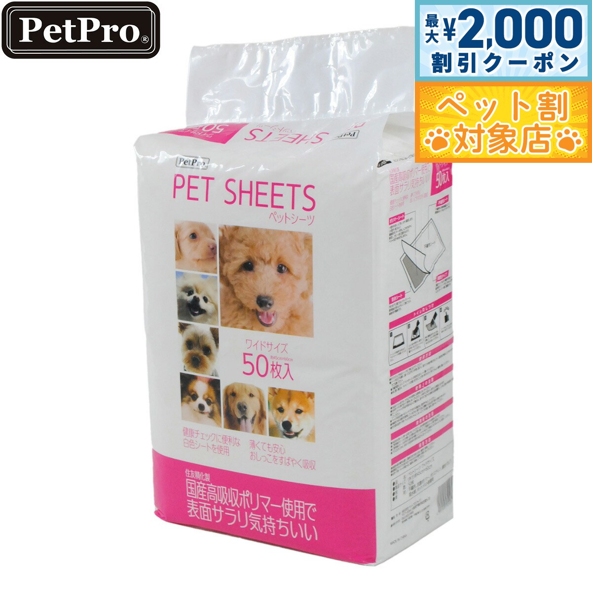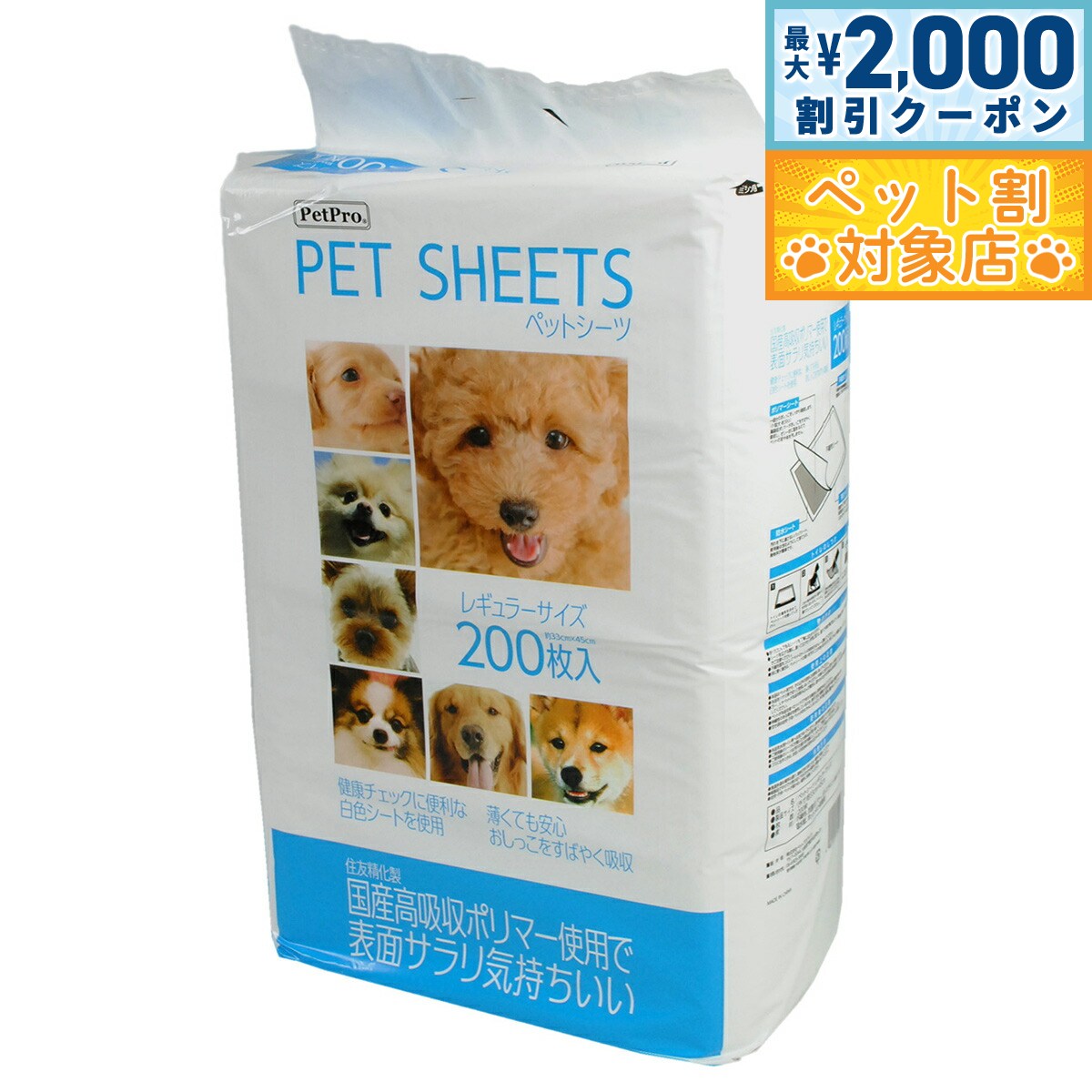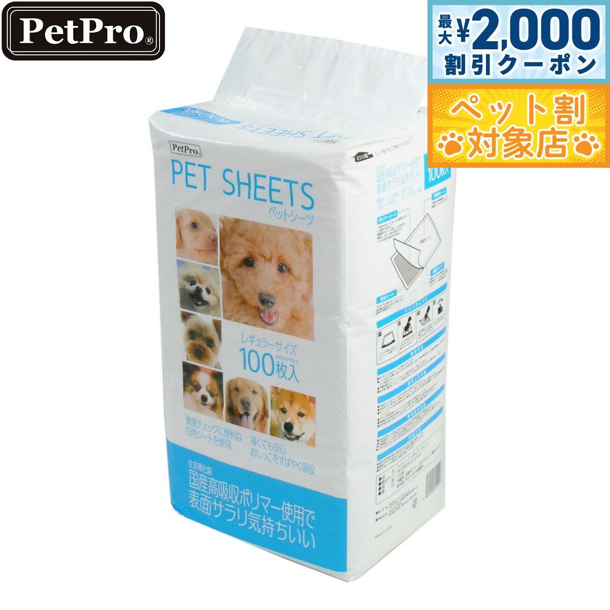 住友精化製、国産高吸収ポリマー使用で尿をすばやく吸収して表面がさらりと気持ちいい!健康チェックに便利な白色シートを使用。薄型タイプなので場所を取らず、経済的でシーツをこまめに交換したいオーナー様に最適です。商品名ペットプロ ペットシーツブランドペットプロ PetPro材質不織布、抗菌ポリマー、ポリエチレン、綿状パルプ、吸水紙、ホットメルト接着剤大きさ1枚当たりのサイズ:約33×45cm生産国中国 【使用方法】・折りたたんであるシーツを丁寧に広げてください。・シーツを広げる際に、振って広げたり手荒に扱うと、破れて中身が飛び出したり、吸収体が偏ることがありますのでご注意ください。・不織布面を上にしてペットのトイレの床またはトレーに敷いて下さい。・床に敷く場合は、ペットシーツの周りを汚すことがありますので、汚れてもよい場所に敷いてください。【使用上の注意】・本品はペット用です。それ以外の目的には使用しないでください。・本品をハサミ等で切って使用しないでください。中身のこぼれや、尿モレの原因となります。・万一、人やペットが本品を飲み込んだ場合は、速やかに吐かせる等の応急処置をとった後。医師や獣医師に相談してください。・ペットが本品を食べたりイタズラをする場合は、使用を中止してください。・伸縮際のある素材を使用しているため、表示寸法と実際の寸法が若干異なる場合があります。・空き袋は幼児・子供・ペットがおもちゃにしないよう、手の届く場所に置かないでください。【使用後の注意】・本品を水洗トイレなどへ流さないでください。排水菅を詰まらせる原因になります。・ご使用後のシーツに付着した大便は必ず取り除いて、ご家庭のトイレなどで処理してください。・ご使用後のシーツは汚れた部分を内側にして、小さく丸めて不衛生にならないように処理してください。・ゴミに出すときは、お住まいの自治体の定める区分に従ってください。【保管方法】・高温多湿な場所は避け、直射日光の当たらない場所に保管してください。・紙製品ですので火気の近くや水のかかる場所に保管しないでください。・幼児・子供・ペットが届かない場所に保管してください。メーカー名株式会社 ペットプロジャパンペットプロ ペットシーツ住友精化製、国産高吸収ポリマー使用で尿をすばやく吸収して表面がさらりと気持ちいい!健康チェックに便利な白色シートを使用。薄型タイプなので場所を取らず、経済的でシーツをこまめに交換したいオーナー様に最適です。