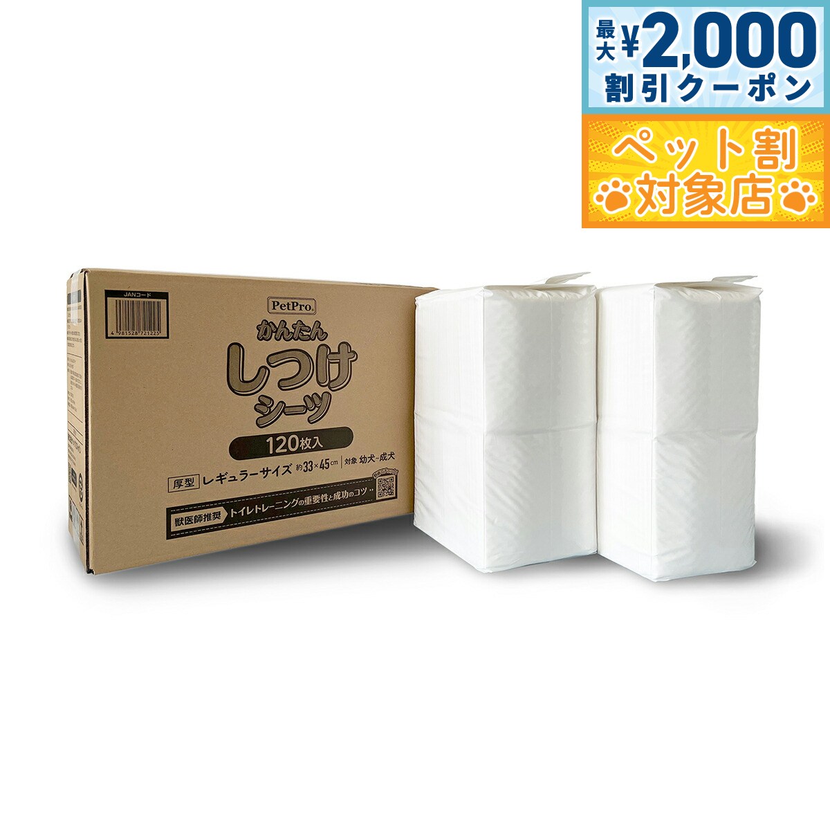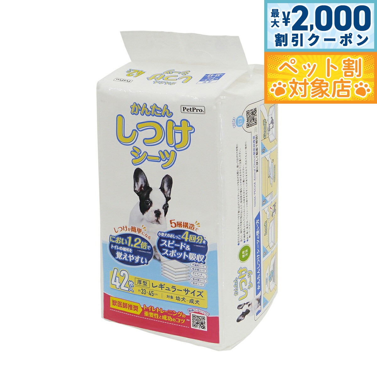 トイレの場所を覚えやすいニオイが1.2倍*!パピーのトイレトレーニングをサポートするシーツです。5層構造(不織布シート・吸水紙シート・ポリマー&パルプシート・吸水紙シート・防水シート)で小型犬のおしっこ4回分(1回約30cc)をスピード&スポット吸収。パッケージのQRコードから獣医師推奨のトイレトレーニング動画が見ることができます。幼犬だけでなく、成犬にもご使用いただけます。(*メーカー従来品との比較)商品名ペットプロ かんたんしつけシーツブランドPET PRO材質表面材:不織布、吸収剤:綿状パルプ、吸水紙、高吸水ポリマー、防水材:ポリエチレン、結合材:ホットメルト接着剤、外装材:ポリエチレン大きさ約33×45cm生産国中国 【5層構造で小型犬のおしっこ4回分(1回分約30cc)をスピード&スポット吸収。トイレのしつけが簡単になるにおい付き!】1.不織布シート:破れにくい不織布を使用し、特殊構造によって表面はいつもサラサラです。2.吸水紙シート:吸水紙でしっかり吸水。3.ポリマー&パルプシート:高吸収ポリマーがおしっこを素早く吸収し、ゼリー状に固まるので、ペットの足や体を汚しません。4.吸水紙シート:吸水紙でしっかり吸水。5.防水シート:汚れを下に通さないバックシート。使用後は包むようにして捨てられ、後始末が簡単です。【使用方法】1.トイレの場所を決めて「かんたんしつけシーツ」を敷いてください。2.愛犬がそわそわしたり、ニオイを嗅ぎ始めたら、シーツの場所まで連れていきます。3.シーツの場所以外でそそうをしてしまった場合は、その場所がトイレでないことを覚えるために、ニオイが残らないようにしっかりと拭き取ってください。4.きちんとシーツの上でできたときは、撫でたりご褒美をあげるなど褒めてあげましょう。何度も繰り返し行うことで習慣づきます。折りたたんであるシーツを丁寧に広げてください。シーツを広げる際に、振って広げたり手荒に扱うと、破れて中身が飛び出したり、吸水体が偏ることがありますのでご注意ください。不織布面を上にしてペットのトイレの床またはトレーに敷いてください。床に敷く場合は、ペットシーツの周りを汚すことがありますので、汚れてもよい場所に敷いてください。【保管方法】・高温多湿な場所は避け、直射日光の当たらない場所に保管してください。・紙製品ですので火気の近くや水のかかる場所に保管しないでください。・幼児・子供・ペットが届かない場所に保管してください。・本品は開封後、ほこりや虫が入らないよう封をしっかり閉じて衛生的に保管してください。【使用上の注意】・本品は犬用のペットシーツです。それ以外の目的には使用しないでください。・本品をハサミ等で切って使用しないでください。中身のこぼれや、尿モレの原因となります。・万一、人やペットが本品を飲み込んだ場合は、速やかに吐かせる等の応急処置をとった後、医師や獣医師に相談してください。・ペットが本品を食べたりイタズラをする場合は、使用を中止してください。・伸縮性のある素材を使用しているため、表示寸法と実際の寸法は若干異なる場合があります。・高吸収ポリマー配合で、尿を吸収しニオイを脱臭する効果がありますが、長く放置すると性能が落ちますので、定期的に新しいシーツと取り替えてください。・空き袋は幼児・子供・ペットがおもちゃにしないよう、手の届く場所に置かないでください。【使用後の注意】・本品を水洗トイレ等へは流さないでください。排水管を詰まらせる原因になります。・ご使用後のシーツに付着した大便は必ず取り除いて、ご家庭のトイレ等で処理してください。・ご使用後のシーツは汚れた部分を内側にして、小さく丸めて不衛生にならないように処理してください。・ゴミに出すときは、お住いの自治体の定める区分に従ってください。対象ペット:犬メーカー名株式会社 ペットプロジャパンペットプロ かんたんしつけシーツトイレの場所を覚えやすいニオイが1.2倍*!パピーのトイレトレーニングをサポートするシーツです。5層構造(不織布シート・吸水紙シート・ポリマー&パルプシート・吸水紙シート・防水シート)で小型犬のおしっこ4回分(1回約30cc)をスピード&スポット吸収。パッケージのQRコードから獣医師推奨のトイレトレーニング動画が見ることができます。幼犬だけでなく、成犬にもご使用いただけます。(*メーカー従来品との比較)