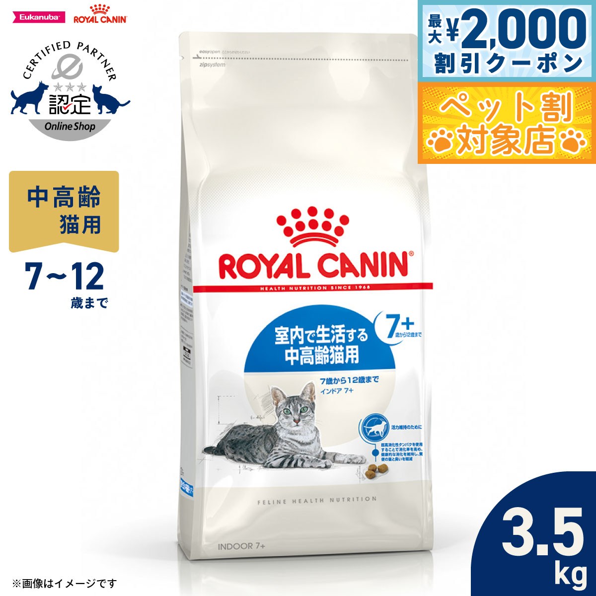 フィーライン ヘルス ニュートリション インドアは、90%以上が消化される超高消化性タンパクを配合し、健康的な消化を維持します。カロリー含有量を適切に調整し、食物繊維を配合することで、ヘアボールの形成を抑制します。『インドア 7+』は目に見えない老化が始まる7歳以上の猫の健康を維持し、活力をサポートするために、ビタミンとミネラルを適切なバランスに調整し、緑茶ポリフェノール、ビタミンC、EPA/DHAを含む最適な栄養成分を配合しました。商品名ロイヤルカナン フィーライン ヘルス ニュートリション インドア 7+ 室内で生活する中高齢猫用(7歳から12歳まで)原材料コーン、肉類(鶏、七面鳥、ダック)、小麦、超高消化性小麦タンパク(消化率90%以上)、大麦、コーンフラワー、コーングルテン、動物性油脂、加水分解タンパク(鶏、七面鳥、魚)、植物性繊維、ビートパルプ、大豆油、酵母および酵母エキス、魚油(オメガ3系不飽和脂肪酸〔EPA+DHA〕源)、サイリウム、塩化アンモニウム、フラクトオリゴ糖、緑茶抽出物(ポリフェノール源)、グルコサミン、マリーゴールド(ルテイン源)、加水分解軟骨(コンドロイチン硫酸源)、アミノ酸類(タウリン、L-カルニチン)、ゼオライト、ミネラル類(Cl、K、Ca、Na、Zn、Mn、Fe、Cu、Se、I)、ビタミン類(コリン、E、C、ナイアシン、ビオチン、A、B2、パントテン酸カルシウム、B6、B1、B12、葉酸、D3)、酸化防止剤(ミックストコフェロール、ローズマリーエキス)賞味期限製造から18ヶ月(メーカー出荷のタイミングによりばらつきがございます。詳細はお問い合わせください。)カロリー377kcal/100g原産国韓国 保証成分:たんぱく質25.0%以上、脂質11.0%以上、粗繊維4.6%以下、灰分7.7%以下、水分6.5%以下【活力維持のために】<インドア 7+>は目に見えない老化が始まる7歳以上の猫の健康を維持し、活力をサポートするために、ビタミンとミネラルを適切なバランスに調整し、緑茶ポリフェノール、ビタミンC、EPA/DHAを含む最適な栄養成分を配合しました。【消化率を高めることで糞便の量と臭いを軽減】運動不足は消化器の働きを緩慢にし、臭いが強い糞便をする原因となります。<インドア 7+>は消化率の非常に高い超高消化性タンパク(L.I.P.*)を配合することで消化率を高め、健康的な消化を維持することで糞便の量と臭いを軽減します。 *L.I.P.:消化率90%以上の超高消化性タンパク(ロイヤルカナン調べ)【健康な腎臓を維持】7歳以上の猫は、腎機能の低下に配慮が必要です。<インドア 7+>は、健康な腎臓を維持するために、リンの含有量を適切に調整します。【泌尿器の健康を維持】中高齢期の猫の健康な泌尿器を維持するためにミネラルバランスを調整しています。メーカー名ロイヤルカナン ジャポン 合同会社メーカー希望小売価格はメーカーカタログに基づいて掲載していますロイヤルカナン フィーライン ヘルス ニュートリション インドア 7+ 室内で生活する中高齢猫用(7歳から12歳まで)フィーライン ヘルス ニュートリション インドアは、90%以上が消化される超高消化性タンパクを配合し、健康的な消化を維持します。カロリー含有量を適切に調整し、食物繊維を配合することで、ヘアボールの形成を抑制します。『インドア 7+』は目に見えない老化が始まる7歳以上の猫の健康を維持し、活力をサポートするために、ビタミンとミネラルを適切なバランスに調整し、緑茶ポリフェノール、ビタミンC、EPA/DHAを含む最適な栄養成分を配合しました。