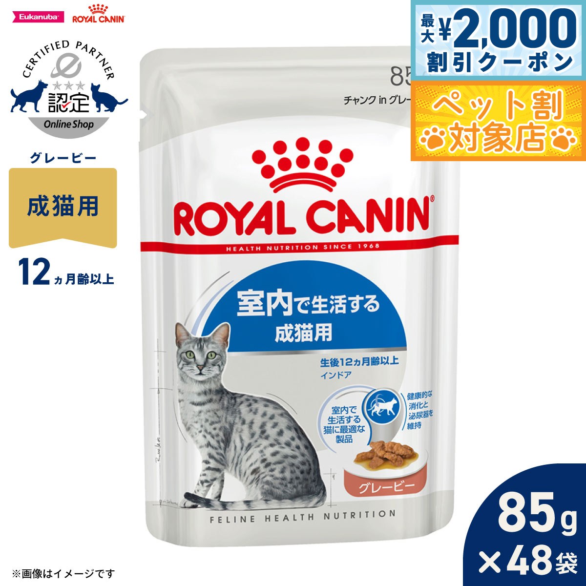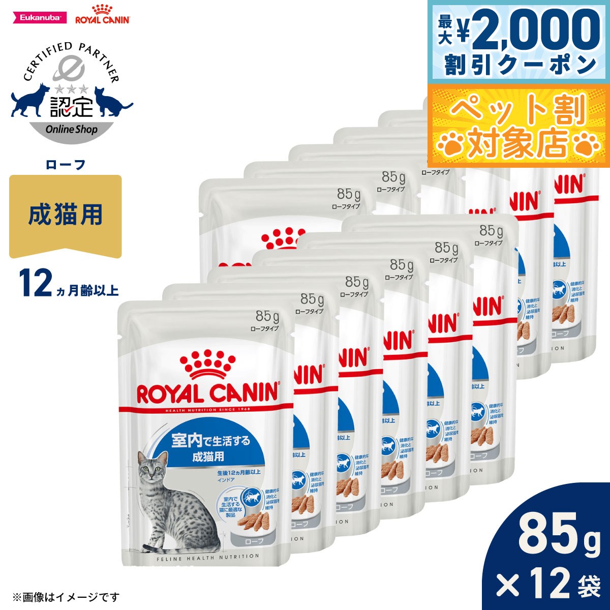 フィーライン ヘルス ニュートリション インドアは、90%以上が消化される超高消化性タンパクを配合し、健康的な消化を維持します。カロリー含有量を適切に調整し、食物繊維を配合することで、ヘアボールの形成を抑制します。運動不足は消化器の働きを緩慢にし、臭いが強い糞便をする原因となります。『インドア』は消化率の非常に高い超高消化性タンパク(L.I.P.*)と適切な食物繊維量、そして特別な栄養素を配合することにより健康的な消化を維持し、糞便の臭いと量を軽減します。商品名ロイヤルカナン フィーライン ヘルス ニュートリション インドア 室内で生活する成猫用(生後12ヵ月齢から7歳まで)原材料小麦、米、肉類(鶏、七面鳥、ダック)、超高消化性植物性タンパク(消化率90%以上)、コーン、動物性油脂、加水分解タンパク(鶏、七面鳥、魚)、小麦粉、植物性繊維、ビートパルプ、大豆油、酵母および酵母エキス、魚油(オメガ3系不飽和脂肪酸〔EPA+DHA〕源)、フラクトオリゴ糖、サイリウム、アミノ酸類(DL-メチオニン、タウリン、L-カル二チン)、ゼオライト、ミネラル類(Cl、Ca、K、Na、P、Zn、Mn、Fe、Cu、Se、I)、ビタミン類(コリン、E、C、ナイアシン、ビオチン、B2、パントテン酸カルシウム、A、B1、B6、B12、葉酸、D3)、酸化防止剤(ミックストコフェロール、ローズマリーエキス)賞味期限製造から18ヶ月(メーカー出荷のタイミングによりばらつきがございます。詳細はお問い合わせください。)カロリー374kcal/100g原産国韓国 保証成分:たんぱく質25.0%以上、脂質11.0%以上、粗繊維4.9%以下、灰分8.3%以下、水分6.5%以下【消化率を高めることで糞便の量と臭いを軽減】運動不足は消化器の働きを緩慢にし、臭いが強い糞便をする原因となります。<インドア>は消化率の非常に高い超高消化性タンパク(L.I.P.*)と適切な食物繊維量、そして特別な栄養素を配合することにより健康的な消化を維持し、糞便の臭いと量を軽減します。 *L.I.P.:消化率90%以上の超高消化性タンパク(ロイヤルカナン調べ)【適度なカロリー含有量】脂肪の含有量を適度に抑え、室内で生活する運動量の少ない猫の健康的な体重維持をサポートします。【食物繊維を配合することでヘアボールの形成を抑制】サイリウム、植物性繊維などの複数の食物繊維を配合した<インドア>は、健康な腸の運動を維持し、飲み込んだ毛の自然な排泄をサポートします。【泌尿器の健康を維持】成猫の健康な泌尿器を維持するためにミネラルバランスを調整しています。メーカー名ロイヤルカナン ジャポン 合同会社メーカー希望小売価格はメーカーカタログに基づいて掲載していますロイヤルカナン フィーライン ヘルス ニュートリション インドア 室内で生活する成猫用(生後12ヵ月齢から7歳まで)フィーライン ヘルス ニュートリション インドアは、90%以上が消化される超高消化性タンパクを配合し、健康的な消化を維持します。カロリー含有量を適切に調整し、食物繊維を配合することで、ヘアボールの形成を抑制します。運動不足は消化器の働きを緩慢にし、臭いが強い糞便をする原因となります。『インドア』は消化率の非常に高い超高消化性タンパク(L.I.P.*)と適切な食物繊維量、そして特別な栄養素を配合することにより健康的な消化を維持し、糞便の臭いと量を軽減します。
