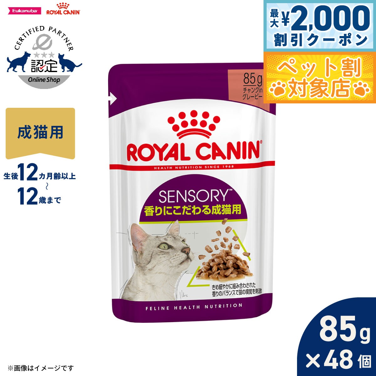 「センサリースメル」は、きめ細かに組み合わされた香りのバランスで猫の嗅覚を刺激します。健康で様々な感覚が刺激される食生活は猫のウェルビーイングを高めることができます。ロイヤルカナン センサリーは、猫の感覚を刺激し、豊かな食体験を提供します。猫が本能的に求める最適な栄養バランス「マクロ ニュートリショナル プロファイル(MNP)」に調整。商品名ロイヤルカナン フィーライン ヘルス ニュートリション ウェット センサリー スメル 香りにこだわる成猫用(12カ月齢以上〜12歳まで)原材料肉類(鶏、豚)、サーモン、小麦タンパク、コーンフラワー、コーンスターチ、セルロース、コーングルテン、加水分解魚肉、酵母、調味料(アミノ酸類)、アミノ酸類(タウリン、メチオニン、グリシン)、増粘安定剤(増粘多糖類)、ミネラル類(K、Ca、Cl、Na、P、Zn、Fe、Cu、Mn、I)、キレートミネラル(Zn、Cu、Mn)、ビタミン類(コリン、D3、E、B1、ナイアシン、B2、パントテン酸カルシウム、B6、葉酸、ビオチン、B12)賞味期限製造から24ヶ月(メーカー出荷のタイミングによりばらつきがございます。詳細はお問い合わせください。)カロリー92kcal/100g原産国オーストリア 保証成分:たんぱく質9.4%以上、脂質0.7%以上、粗繊維1.5%以下、灰分1.8%以下、水分82.6%以下【嗅覚で食欲を刺激】きめ細やかに組み合わされた香りのバランスで猫の嗅覚を刺激。【感覚を刺激】健康で様々な感覚が刺激される食生活は猫のウェルビーイングを高めることができます。ロイヤルカナン センサリーは、猫の感覚を刺激し、豊かな食体験を提供します。【猫が本能的に求める栄養バランス】猫が本能的に求める最適な栄養バランス「マクロ ニュートリショナル プロファイル(MNP)」に調整。メーカー名ロイヤルカナン ジャポン 合同会社メーカー希望小売価格はメーカーカタログに基づいて掲載していますロイヤルカナン フィーライン ヘルス ニュートリション ウェット センサリー スメル 香りにこだわる成猫用(12カ月齢以上〜12歳まで)「センサリースメル」は、きめ細かに組み合わされた香りのバランスで猫の嗅覚を刺激します。健康で様々な感覚が刺激される食生活は猫のウェルビーイングを高めることができます。ロイヤルカナン センサリーは、猫の感覚を刺激し、豊かな食体験を提供します。猫が本能的に求める最適な栄養バランス「マクロ ニュートリショナル プロファイル(MNP)」に調整。