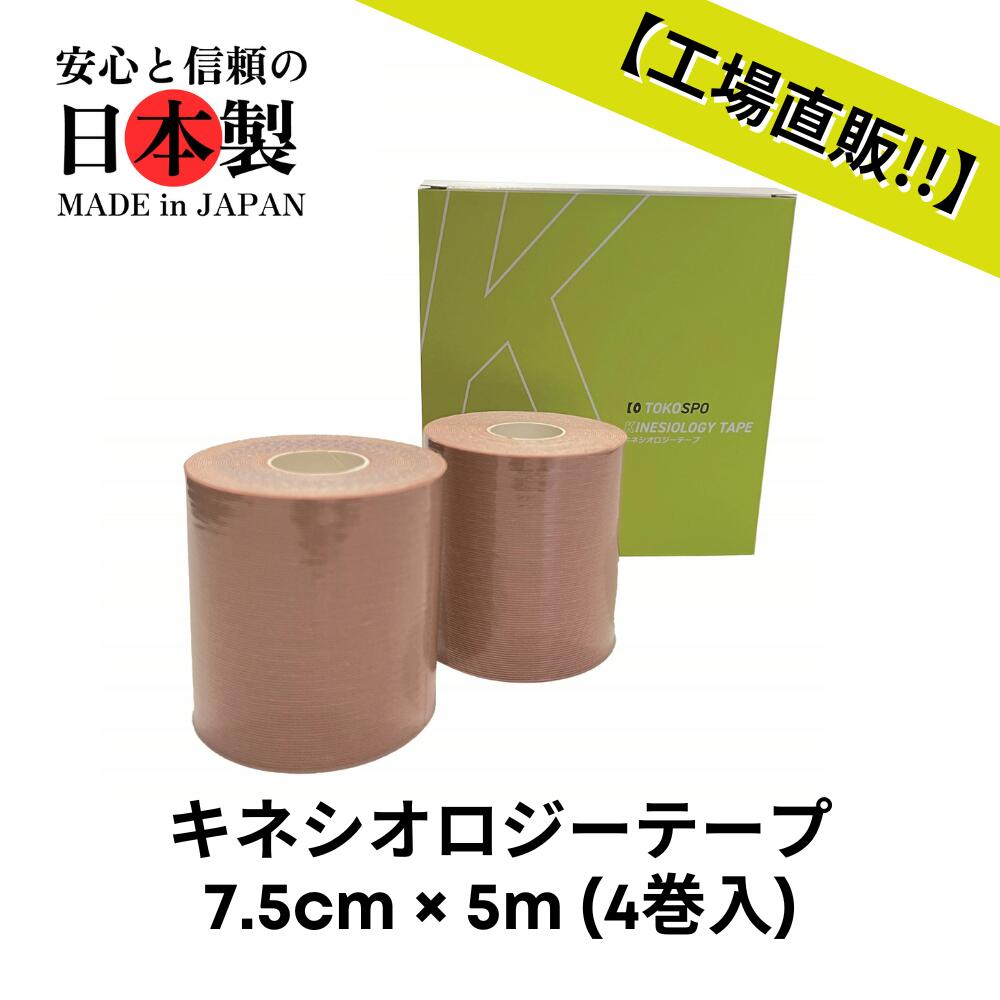 商品情報 サイズ 75mm×5m 入数 4巻(1箱) 色 ベージュ タイプ 撥水【送料無料】キネシオテープ 撥水 伸縮 テーピング 幅75mm×5m 4巻(1箱) ベージュ スポーツ 外反母趾 巻き爪 ばね指 肩こり 腰痛 膝痛 関節痛 捻挫 疲労回復 キネシオ キネシオロジーテープ 最安値に挑戦!!!!キネシオテープをお得にお買い求めいただけます。※こちらの商品は【幅75mm×5m 4巻(1箱)】です。 最安値に挑戦!!!!キネシオテープをお得に、大容量でおもとめいただけます。部活、スポーツ、治療院の大量消費の際にコスパよくご利用いただけます。撥水加工が施されているので雨の日や汗にも安心してお使いいただけます。粘着剤はウェーブ形状のため、通気性にすぐれ蒸れにくくなっております。 2
