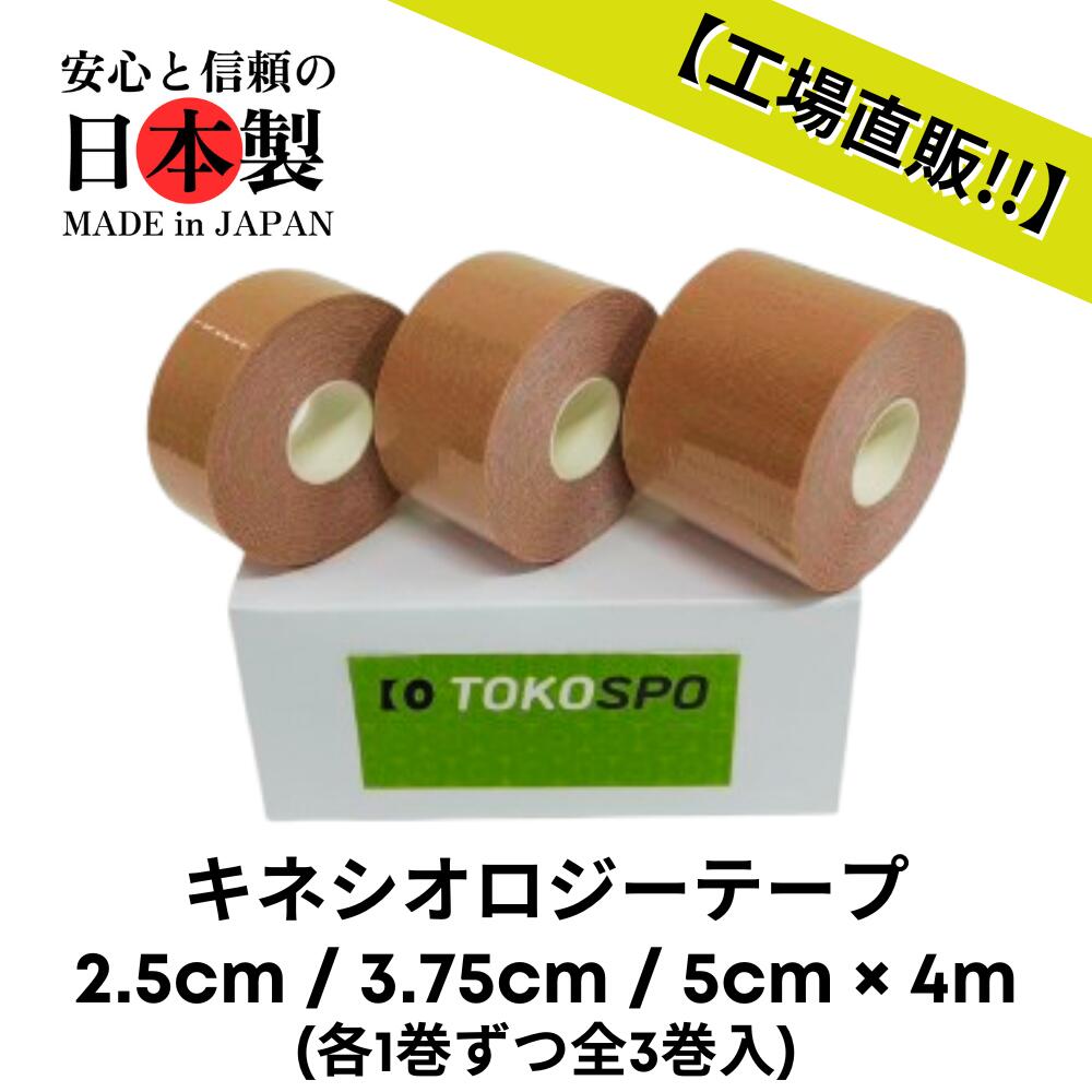 商品情報 サイズ 2.5cm / 3.75cm/ 5cm × 4m 入数 各1巻入・全3巻色ベージュタイプ撥水【送料無料】キネシオテープ 撥水 伸縮 テーピング 幅2.5cm / 3.75cm/ 5cm × 4m(各1巻入・全3巻) ベージュ スポーツ 外反母趾 巻き爪 ばね指 肩こり 腰痛 膝痛 関節痛 捻挫 疲労回復 キネシオ キネシオロジーテープ 最安値に挑戦!!!!キネシオテープをお得にお買い求めいただけます。※こちらの商品は【幅2.5cm / 3.75cm/ 5cm × 4m(各1巻入・全3巻)】です。 「試してみたい!」お手頃価格に挑戦中!!!埼玉県所沢市の工場で製造・加工された純日本製のテーピング。30年以上培ってきたノウハウを活かして、極限まで製造ロスを減らし、仲介業者を介さずに全て自社で対応!これにより日本製で普通はありえないリーズナブルな価格を実現しています。撥水加工が施されており、雨の日・発汗にも安心してお使いいただけます。粘着剤はウェーブ形状のため、通気性にすぐれた蒸れにくい構造です。「気になるけどそんなにたくさんは・・・」方におすすめ!!! 2
