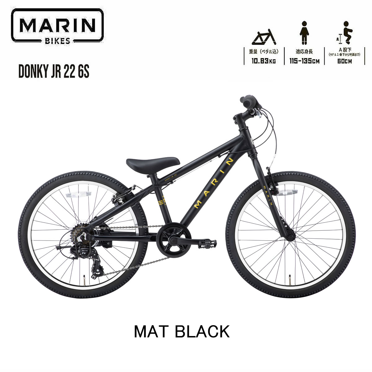 【店舗受取・西濃運輸支店止め送料無料】 ご自宅配送も可能ですが別途送料かかります。詳しくは送料表をご確認ください 【ドンキージュニア22 別カラーございます 】 *サイドスタンド、リング錠(ダイヤル式)、RDガード付き 「20インチは少し小さい、24インチは少し大きい」というお子様におススメです。小回りが利くので16 インチ・18 インチから22インチに乗りかえても安心です。身長が低いお子様でも乗りやすい特別な一体型サドルを使用しています。6 段変速で坂道もスイスイ登れ、太いタイヤで草むらや土の上などもガンガン走れます。そろそろスポーツや習い事が始まる年齢だと思います。お友達と一緒に帰る事も多くなる中で、自慢できる自転車を目指しました。ブレーキもお子様の手の大きさに合わせて、握りやすくなっています。 SIZE:22inch 適正身長:115cm?135cm 股下:60cm(*サドルを一番下にした時) WEIGHT:11.47kg 付属品 *サイドスタンド標準装備 *GORIN馬てい型リング(ダイヤル式) *RDガード標準装備 *MARINコットンバック 【スペック】 Frame: Aluminum Donky Jr. 22″ Kids Frame Fork: Steel, Straight Blade, 1 1/8″ Steer Rim: Marin Double Wall Aluminum, Machined Sidewall Hub Rear: Steel, 32H Hub Front: Steel, 32H Spokes Nipples: 14g Stainless Steel Tires: MARIN x VEE TIRE CO. Speedster, 22×2.0″ Shift Lever: Shimano TX30 6s Derailleur Front: N/A Derailleur Rear: Shimano Tourney TY300 Crankset: 3-Piece Aluminum Crank, 32t, Chainring, 140mm Arm Length Double Guard Bottom Bracket: Sealed Cartridge Bearing, Square Taper 68/122.5mm Chain: KMC HV-500 Cassette: Shimano TZ500 6-speed, 14/28T Brakes Front: Tektro V-Brake (837AL) Brakes Rear: Tektro V-Brake (837AL) Brake Levers: Kids Aluminum Brake Levers (TS325A) Handlebar: Marin Steel MTB 25.4mm Stem: Marin Alloy 25.4mm Grips: Kids Grips Headset: FEIMIN 1-1/8 Seatpost / Clamp: Integrated w/ Saddle 27.2mm / 31.8mm (Seat Clamp) Saddle: Marin Kids w/ Integrated Seat Post Pedals: Kids Pedals Training Wheels: Gorin馬てい型リング(ダイヤル式) Chain Guard: N/A Bag: Marin Oso Cotton Bag Stand: Steel Rear Mount Kickstand Option 1: Rear Derailleur Guard Option 2: N/A