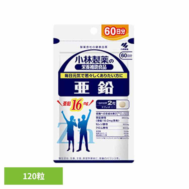 毎日元気で若々しくありたい方に※リニューアルに伴い、パッケージ・内容等予告なく変更する場合がございます。予めご了承ください。●商品サイズ(cm)幅約12×奥行約0.5×高さ約14●商品重量約0.037kg●内容量120粒【1粒重量250mg】1日の目安:2粒1日2粒を目安に、かまずに水またはお湯とともにお召し上がりください。食生活は、主食、主菜、副菜を基本に、食事のバランスを。●商品区分健康食品●原材料亜鉛酵母(国内製造)、麦芽糖、セレン酵母、クロム酵母/結晶セルロース、微粒酸化ケイ素、シェラック、ステアリン酸カルシウム●成分(製造時、1日目安量あたりの含有量)亜鉛酵母(亜鉛16.0mg含有) 320.0mgセレン酵母 30.0mgクロム酵母 30.0mg麦芽糖 72.0mg結晶セルロース 40.0mg微粒酸化ケイ素 8.0mgコーティング材:シェラック、ステアリン酸カルシウム栄養成分表示<1日目安量(2粒)あたり>エネルギー 1.8kcalたんぱく質 0.19g脂質 0.022g炭水化物 0.22g食塩相当量 0.00022〜0.0089g亜鉛 16.0mgセレン 60μgクロム 60μgカルシウム 0.056〜0.56mg●原産国:日本●アレルギー物質なし○広告文責:e-net shop株式会社(03-6706-4521)○メーカー(製造):小林製薬○区分:日本製・健康食品(検索用:亜鉛 健康食品 4987072014325)最強翌日配送対象商品に関するご案内 最強翌日配送対象商品・対象地域に該当する場合は最強翌日配送マークがご注文カゴ近くに表示されます。 最強翌日配送可能なお支払方法は【クレジットカード、代金引換、全額ポイント支払い】のみとなります。 下記の場合は最強翌日配送対象外となります。 ・15点以上ご購入いただいた場合 ・時間指定がある場合 ・ご注文時備考欄にご記入がある場合 ・決済処理にお時間を頂戴する場合 ・郵便番号や住所に誤りがある場合 ・最強翌日配送対象外の商品とご一緒にご注文いただいた場合 ・お届け先住所文字数が40文字以上の場合