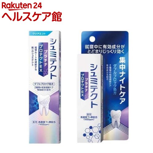 お店TOP>日用品>オーラルケア>歯磨き(ハミガキ)>歯磨き粉>シュミテクト プラチナプロテクトEX クリアミント +集中ナイトケア (1セット)商品区分:医薬部外品【シュミテクト プラチナプロテクトEX クリアミント +集中ナイトケアの商品詳細】★薬用シュミテクト プラチナプロテクトEX 集中ナイトケア●知覚ルートを遮断するシュミテクト。就寝中に有効成分が歯にとどまりじっくり効く。集中ナイトケア。●ダブルブロック処方。●2種類の知覚過敏ケア有効成分を配合。知覚過敏の原因の一つ、歯周病※(歯ぐきの退縮)を予防。●マイルドミントのフレーバー。●効能効果:歯がしみるのを防ぐ。歯肉炎の予防。歯周炎の予防。ムシ歯の発生および進行の予防。口臭の防止。タバコのヤニ除去。歯を白くする。口中を浄化する。口中を爽快にする。※歯肉炎・歯周炎★薬用シュミテクト プラチナプロテクトEX クリアミント●知覚ルートを遮断するシュミテクト。●ダブルブロック処方。●2種類の知覚過敏ケア有効成分を配合。クリアミントのフレーバー。●効能:効果は歯がしみるのを防ぐ。ムシ歯の発生および進行の予防。歯を白くする。口中を浄化する。口中を爽快にする。【販売名】シュミテクトA3f、シュミテクトA1f組合せを行った者の住所及び名称<br>〒158-0094 東京都世田谷区玉川一丁目14番1号 楽天クリムゾンハウス<br>楽天グループ株式会社【効能 効果】★薬用シュミテクト プラチナプロテクトEX 集中ナイトケア:歯がしみるのを防ぐ。歯肉炎の予防。歯周炎の予防。ムシ歯の発生および進行の予防。口臭の防止。タバコのヤニ除去。歯を白くする。口中を浄化する。口中を爽快にする。★薬用シュミテクト プラチナプロテクトEX クリアミント:歯がしみるのを防ぐ。ムシ歯の発生および進行の予防。歯を白くする。口中を浄化する。口中を爽快にする。【使用方法】・適量をハブラシにとり、ていねいに歯と歯ぐきをブラッシングし、飲み込まずに口をすすいでください。・1日2〜3回のハミガキがお勧めです。・使用を止めると、再びシミ始めるおそれがあります。シミなくなっても、続けてご使用ください。【成分】★薬用シュミテクト プラチナプロテクトEX 集中ナイトケア:ソルビット液、濃グリセリン、精製水、含水ケイ酸、硝酸カリウム、ポリエチレングリコール400、乳酸アルミニウム、モノフルオロリン酸ナトリウム、グリチルリチン酸モノアンモニウム、含水ケイ酸、水酸化Na、香料、サッカリンNa、ヤシ油脂肪酸アミドプロピルベタイン、ヒドロキシエチルセルロース、酸化Ti★薬用シュミテクト プラチナプロテクトEX クリアミント:ソルビット液、濃グリセリン、精製水、含水ケイ酸、硝酸カリウム、乳酸アルミニウム、モノフルオロリン酸ナトリウム、含水ケイ酸、水酸化Na、ヤシ油脂肪酸アミドプロピルベタイン、ヒドロキシエチルセルロース、香料、サッカリンNa、酸化Ti、L-メントール【注意事項】★薬用シュミテクト プラチナプロテクトEX 集中ナイトケア・6歳未満には使用させないでください。・歯周病(歯肉炎・歯槽膿漏)の症状が持続している方、歯ぐきからの出血がみられる小児の場合は、治療を要する疾患も考えられますので歯科医師にご相談ください。・歯がしみる症状には、早急に歯科医師の治療を要する疾患も考えられます。症状が持続する場合には歯科医師にご相談ください。・本剤の使用により異常が現れた場合は使用を中止してください。・本剤の使用により口腔内・顔面のはれが現れた場合は直ちに医師又は歯科医師にご相談ください。・小児の使用に際しては医師、歯科医師へのご相談をおすすめします。・キャップをしめて、小児の手の届かないところに保管してください。・ムシ歯にともなう歯の痛みには効果がありません。ムシ歯でしみる場合は、歯科医師による治療を受けてください。★薬用シュミテクト プラチナプロテクトEX クリアミント・6歳未満には使用させないでください。・歯がしみる症状には、早急に歯科医師の治療を要する疾患も考えられます。症状が持続する場合には歯科医師にご相談ください。・本剤の使用により異常が現れた場合は使用を中止してください。・本剤の使用により口腔内・顔面のはれが現れた場合は直ちに医師又は歯科医師にご相談ください。・小児の使用に際しては医師、歯科医師へのご相談をおすすめします。・キャップをしめて、小児の手の届かないところに保管してください。・ムシ歯にともなう歯の痛みには効果がありません。ムシ歯でしみる場合は、歯科医師による治療を受けてください。【構成品明細】この組合せ商品の商品構成は以下となります。構成する商品の返品及びキャンセル時は以下明細の単価を適用させていただきます。・4987977000362:薬用シュミテクト プラチナプロテクトEX 集中ナイトケア (30g)×1(個数) 1078円(販売単価)・4987977000324:薬用シュミテクト プラチナプロテクトEX クリアミント (90g)×1(個数) 1408円(販売単価)【