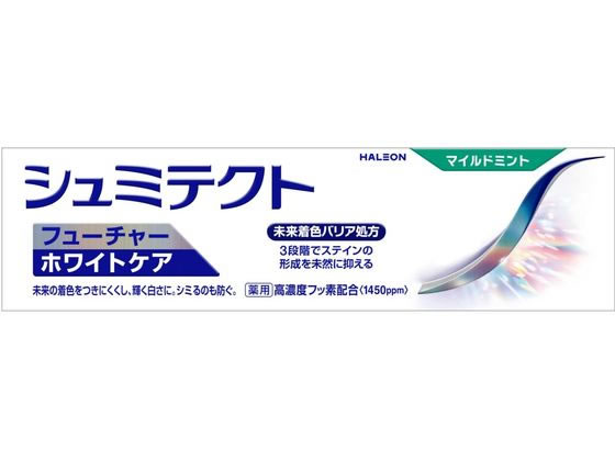 【商品説明】●未来の着色をつきにくくし、輝く白さに。シミるのも防ぎ、白い歯のための3段階アプローチの未来着色バリア処方。●微粒子シリカ※1が届きにくいところまで入り込み、汚れを徹底除去(歯を白くする)。(※1含水ケイ酸:清掃剤)●ダイヤモンドパウダー※2がツヤやかに歯を磨いて未来の着色をつきにくくします。(※2酸化Al:清掃剤)●未来着色のもとになる汚れを歯につきにくい状態にし、ステイン形成を未然に抑えます。【仕様】●内容量:80g生産国:日本商品区分:医薬部外品メーカー:Haleonジャパン株式会社広告文責:フォーレスト株式会社 0120-40-4016【備考】※メーカーの都合により、パッケージ・仕様等は予告なく変更になる場合がございます。【検索用キーワード】シュミテクトフューチャーホワイトケアマイルドミント80g Haleonジャパン ヘイリオンジャパン へいりおんじゃぱん Haleon シュミテクト 高濃度フッ素配合 知覚過敏 Haleon 未来着色バリア処方 R024MM未来着色をつきにくく輝く白さ シミるのも防ぐ