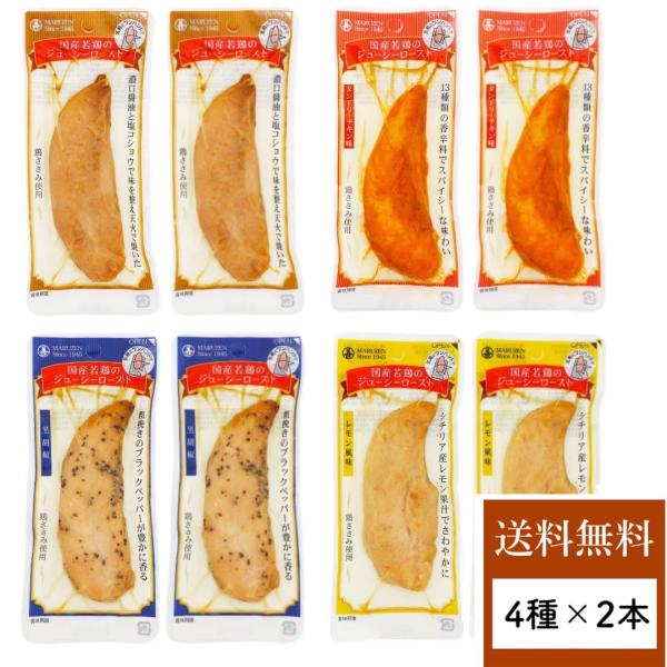 国産メ[カー丸善のロングセラー!国産の若鶏を使用したサラダチキンバー・スティックタイプの個包装なので食べやすい【商品名】サラダチキンまとめ買いサラダチキンバー常温保存丸善ジューシーロースト8袋セットヘルシーおかず鶏肉ささみスティック個包装国産メ[カー【セット内容】国産若鶏のジューシーローストの全種(4種類)8本セット(内訳)プレーン味:2本黒胡椒味:2本タンドリーチキン味:2本レモン風味:2本【プレーン味】国産の鶏ささみを丸大豆しょうゆと香味野菜のタレに漬け込み、味慣れを待って天火でジューシーに仕上げました。